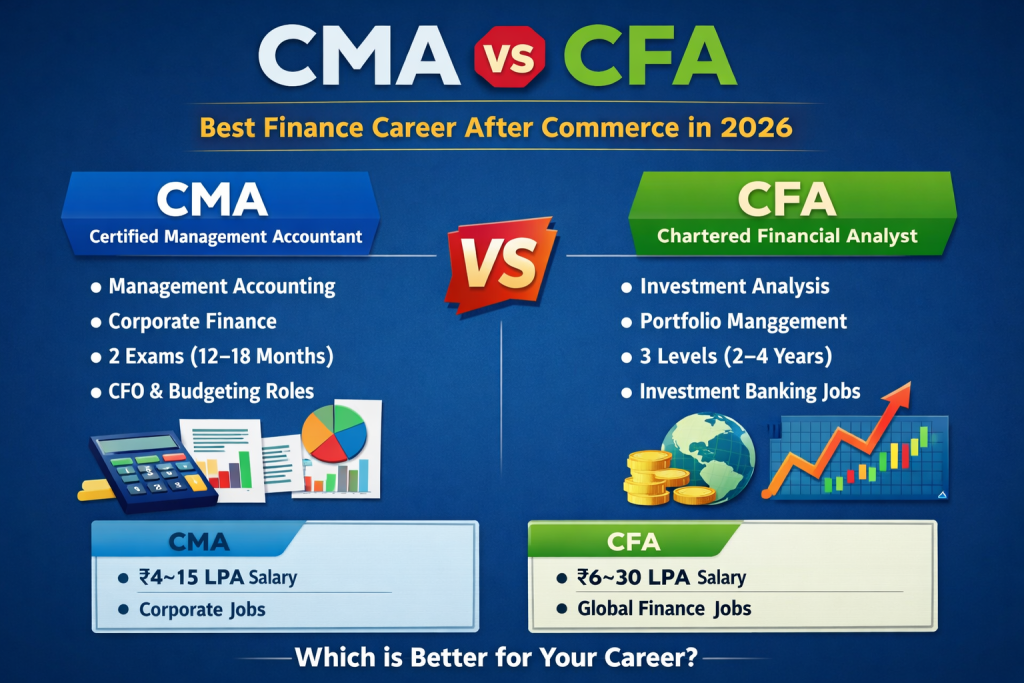 This detailed guide is specially written for commerce students in India, Bihar, and Patna who are searching for answers like: “CMA vs CFA which is better after commerce?”, “CMA course after 12th – is it worth it?”, and “Best finance career option in 2026”.